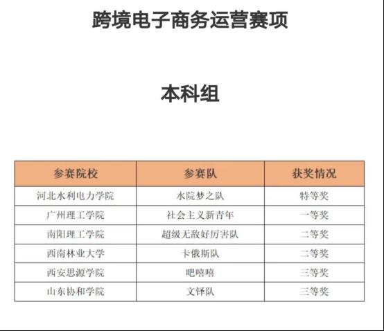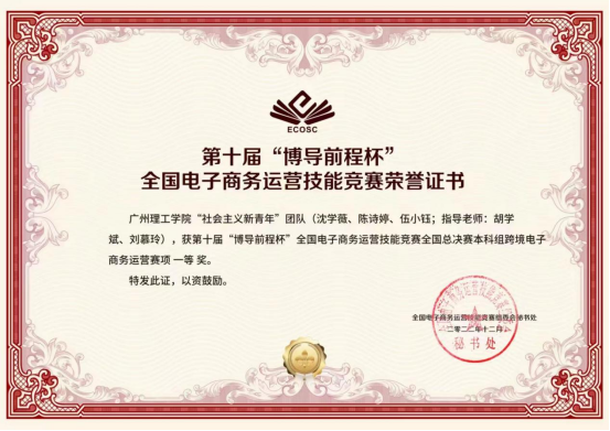 太阳成集团tyc151cc胡学斌、刘慕玲老师指导的“社会主义新青年队”(沈学薇、陈诗婷、伍小钰)先在省赛阶段(本科组,跨境电子商务运营赛项)全省第一名,晋级国赛。在国赛阶段,“社会主义新青年队”位列全国第二名荣获全国一等奖的喜人成绩。