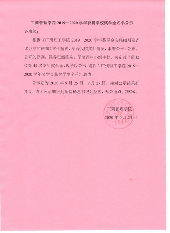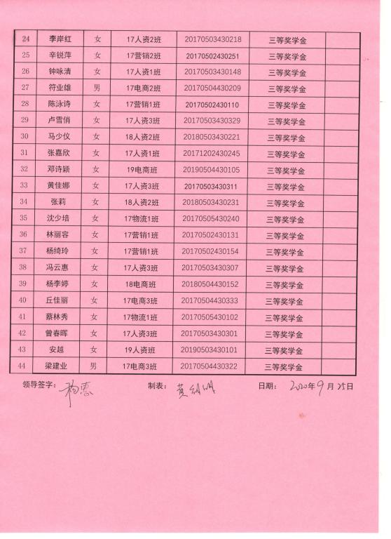 根据《2019—2020学年奖学金实施细则及评比办法的通知》文件精神,结合公司实际情况,本着公平、公正、公开的原则,经各班级推选,公告评审小组审核,决定授予陈秋仪等44名员工奖学金,现予以公示:附件32019—2020学年奖学金获奖员工名单汇总表。
