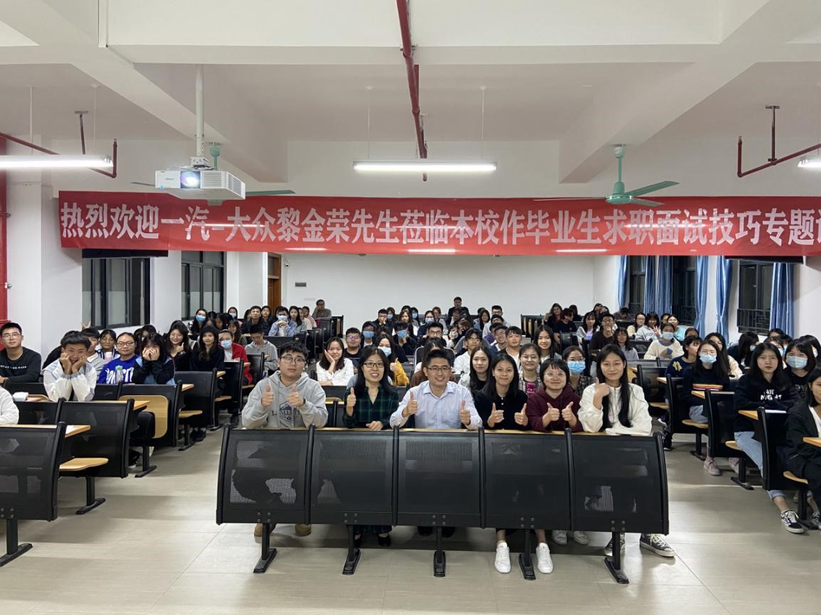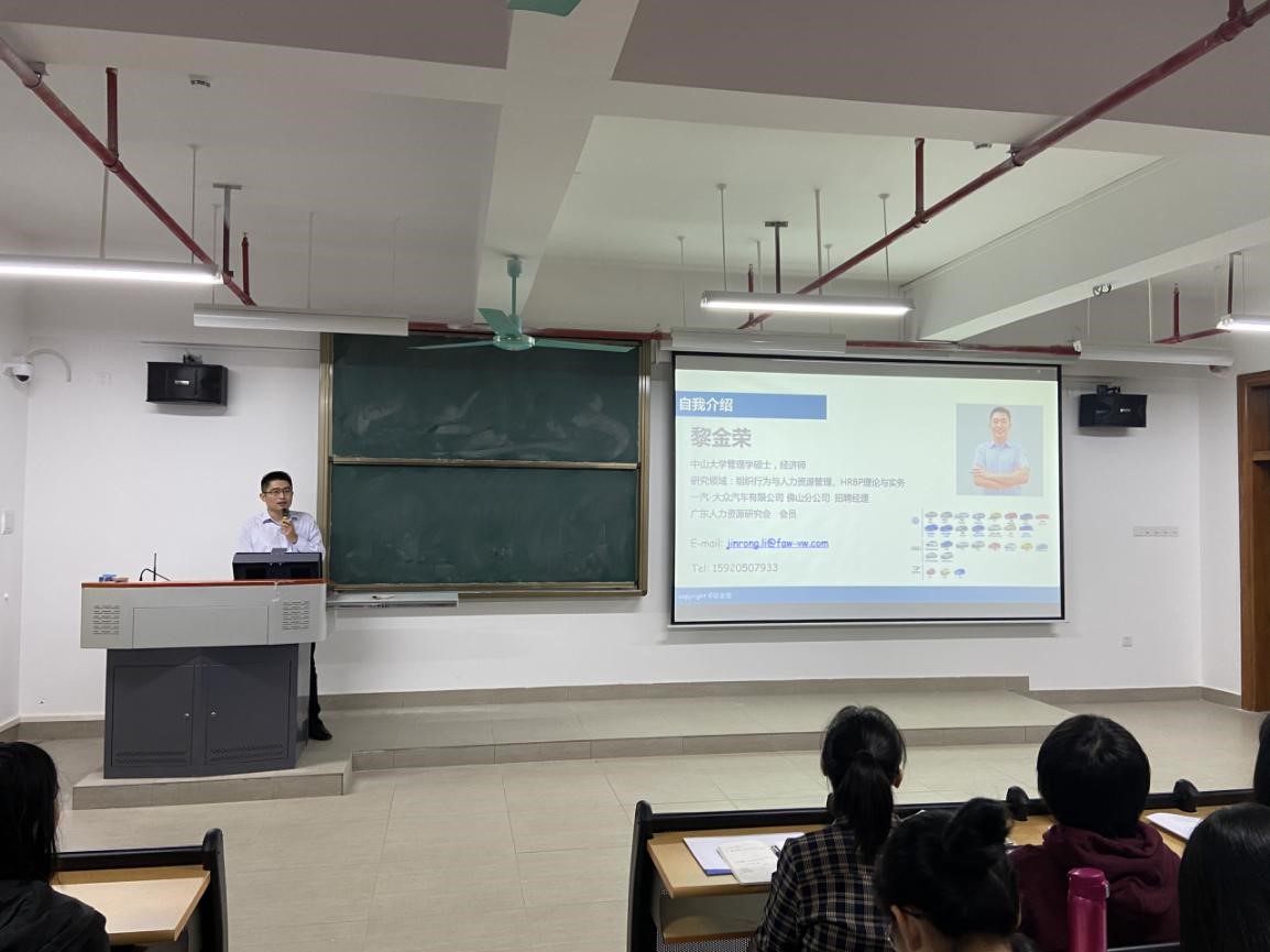 太阳成集团tyc151cc于11月12日晚在13—501有幸邀请到一汽-大众汽车有限公司佛山分公司经理黎金荣先生为公司人资毕业生等举行一场关于面试方法与技巧的专题讲座。公司常务副经理胡高喜经理、人力资源管理系主任刘琰老师、17级人力资源管理专业全体员工、18级人力资源管理2班、20级人力资源管理专业部分员工代表参加了此次讲座,本次讲座由17人资1班黎岳镔同学主持。