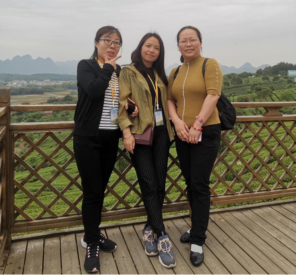 | 从右至左:李美珍副经理、杨惠书记、刘琰老师参观茶山 |