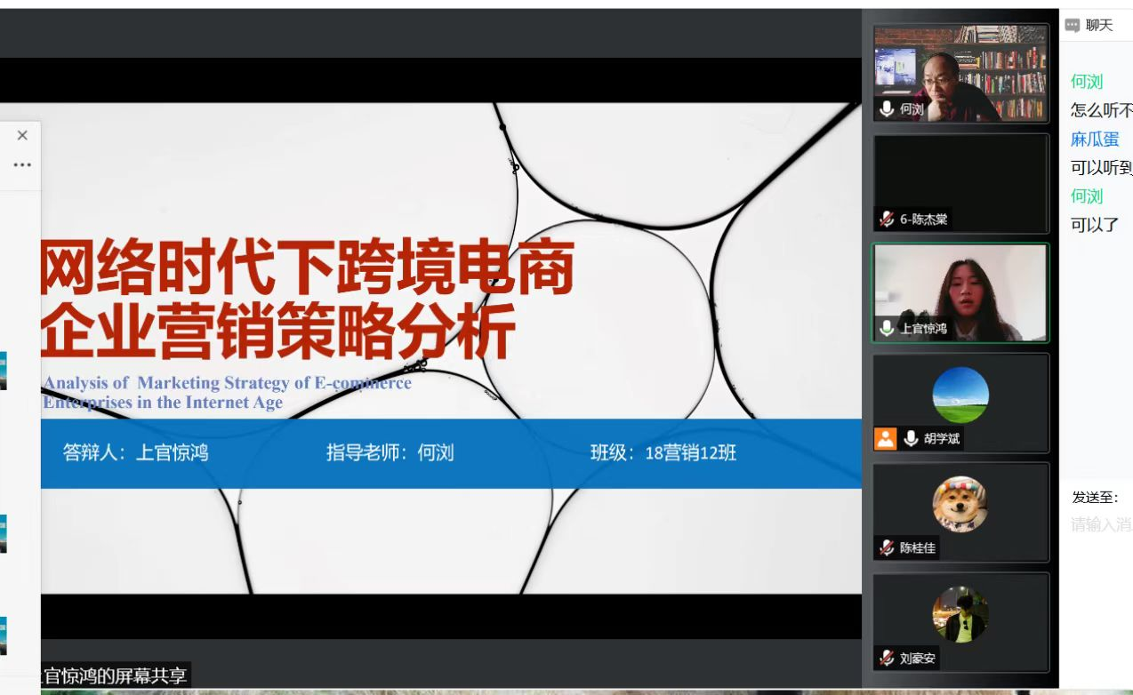 在答辩正式开始前,毕业生宣读了诚信声明,对自己的论文内容进行保障,确保论文内容的真实性,准确性。线下答辩会上,毕业生按顺序依次参加答辩,答辩过程主要为现场陈述和评委老师提问两个环节。在现场陈述环节,同学们思路清晰,从容不迫,灵活运用所学的专业知识,对自己的论文展开精彩论述。在提问环节,各组答辩老师秉持着严谨、负责的态度,对同学们专业知识掌握的熟练程度进行了考察,并对同学们的毕业论文提出了进一步的修改建议。线上答辩会,老师和身在疫情防控区及应征入伍员工打破时空界限,在云端上进行毕业论文的汇报并与答辩教师进行交流,通过互联网构建了一场场精彩的线上毕业答辩。