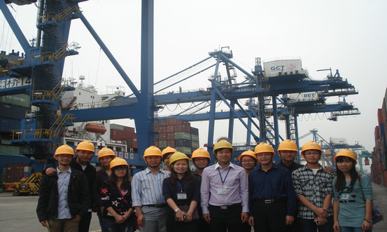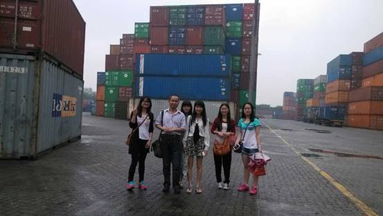 在差不多到的时候,一路上就已经可以看到许多卡车运着各种集装箱经过。进入公司大门,就可以看到堆得六七层高的集装箱,分门别类地堆放在公司的外堆场上。公司负责人告诉我们,一般集装箱堆放的高度是7个,堆放在场地的中间位置,边上的集装箱与堆场中间的集装箱之间需要有空出通道,同事在集装箱与仓库之间,也需要留空位置用以大型叉车作业。在这里,我们看到来自不同物流公司的集装箱,有我们较常见的CMCC、马士基等集装箱。走过了集装箱堆场,公司负责人带我们来到仓库。我们看到在仓库前面是一个装卸平台,正靠着铁路旁边,这方便铁路运输装卸货物。此仓库高约5米,里面分成若干区域用托盘整齐地堆放着货物,每个区域有着明显的标记记号,这方便仓管人员清点管理。在我们参观完集装箱堆场,我们接着乘车去到了广州集装箱码头有限公司的新港码头简称(GCT)。由于安全需要,我们同学都是在车上进行巡观,在这里我们看到许多大型机械,如龙门吊、装卸桥、门机、大型拖车等,还正好看到一艘上海中谷的集装箱货船在卸货,看到各种机械的运作,真是大开眼界。