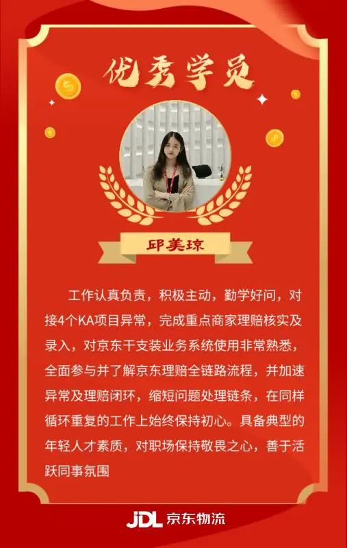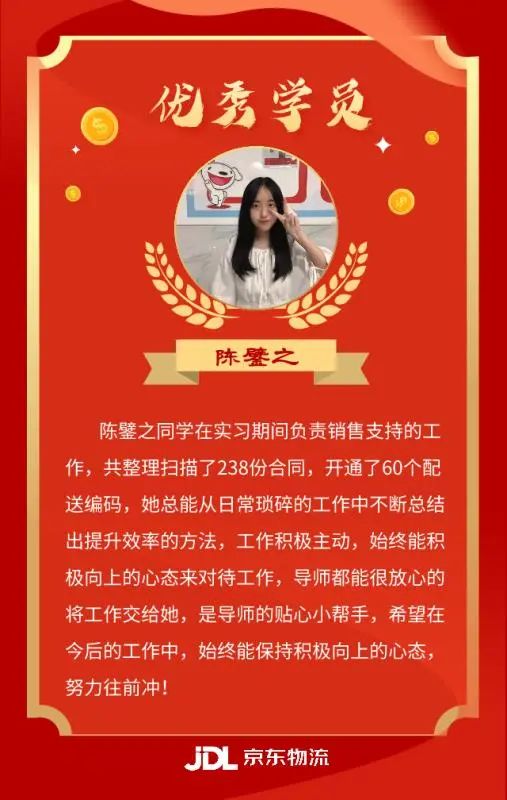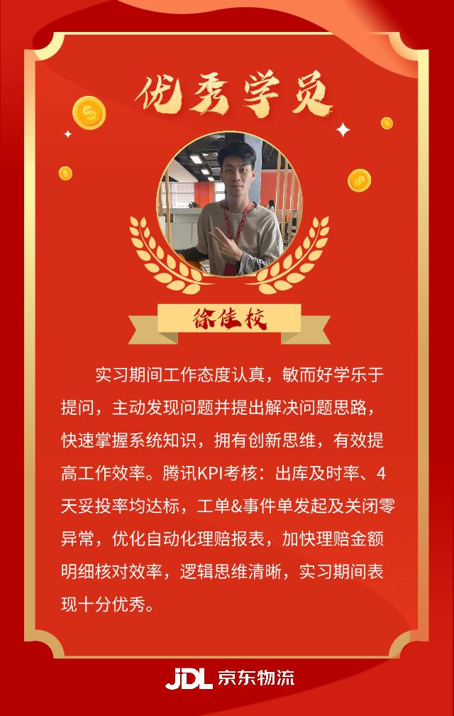 经过快一个月的京东实习,学习到了很多课本以外的知识,使我在实践中打开视野,增长见识,为以后走向社会打下了一定的基础,同时这也是我走向岗位的第一步。很高兴能在本次为期一个月的实习中获得“京东绿卡”,感谢导师们对我的肯定和支持,感谢公司给予这次实习的机会,让我有所成长。“绿卡”对我而言是一个开始,也是一种动力,我会戒骄戒躁,不断成长,不断的提升自己的综合能力,未来可期!(邱美琼同学)
