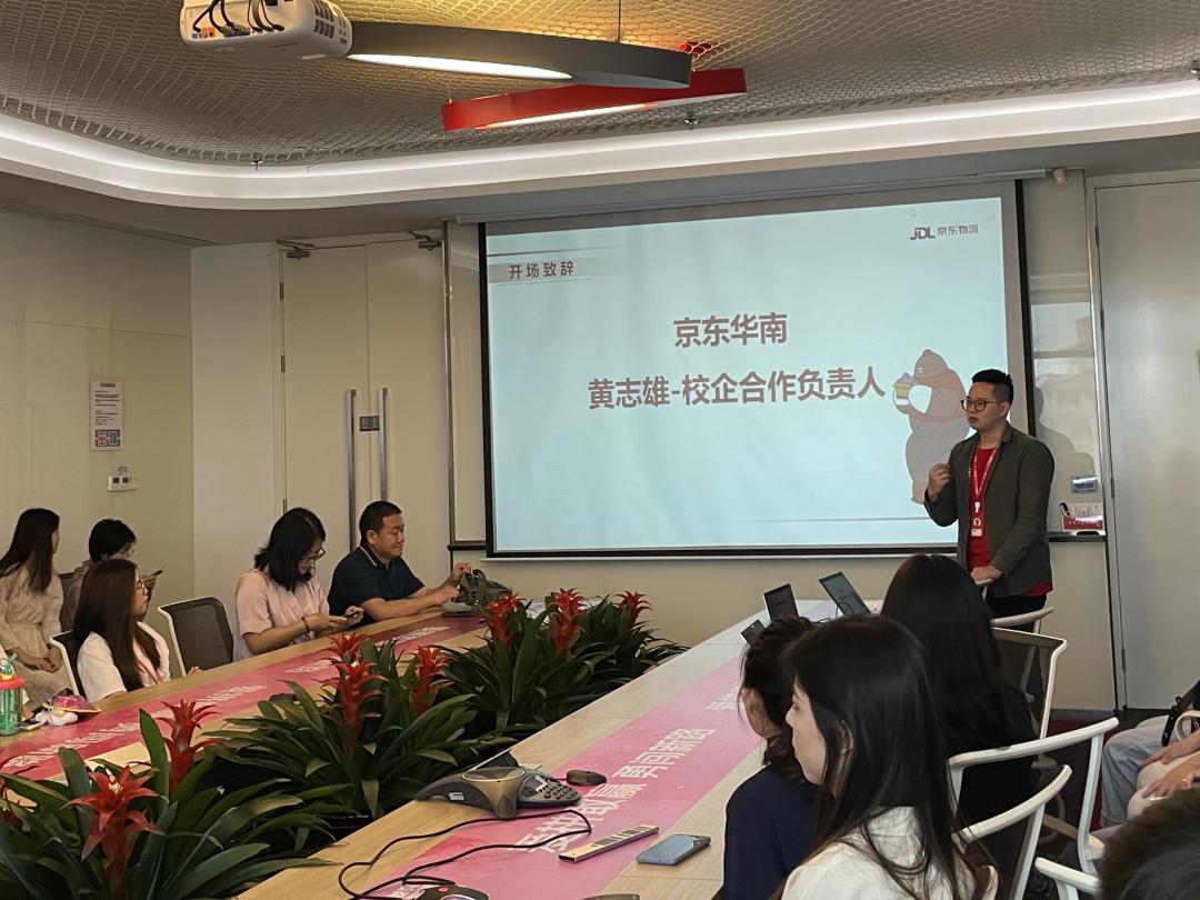 紧接着是秦金中老师代表校方致辞。首先,他对此次实习活动进行总结。感谢京东物流集团给予这样的一次机会,让同学们感受到职场与公司的不同,提前感受到职场氛围,以及京东的企业文化。在这个月实习过程中,同学们全方面有所提高,同时也要发现自身问题。接着,他表示由于营销专业是第一次来京东华南总部进行实习,但同学们出色的表现,让他消除了顾虑,并会对此次校方部分的问题进行跟进与反馈。最后,他希望同学们学会责任与感恩,提高自身能力。