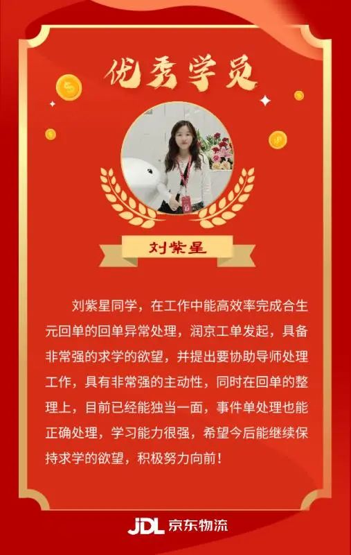 短暂的一个月京东实习,让我从公司到社会,而我在体验这个过程的一个月中,明白了要做好一份工作,细心,耐心,积极主动的心态是必不可少的。在导师的悉心指导下,我能够高质量高效率的去完成大量数据的异常处理,从简到难,循序渐进。我很荣幸能够加入京东这个有爱的大家庭,并且获得京东的绿卡,我相信在以后的日子里,自己的各方面都会有所提高。(刘紫星同学)