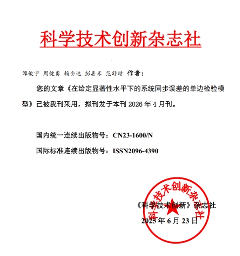 在戚蕊、王祺敏两位指导老师的带领下,团队历时五个月,将物联网技术、智能算法与物流管理深度融合,打造出具有创新性的解决方案。值得一提的是,团队在备赛期间还将研究成果整理成学术论文《在给定显著性水平下的系统同步误差的单边检验模型》,被《科学技术创新》杂志录用,将于2026年4月刊发。