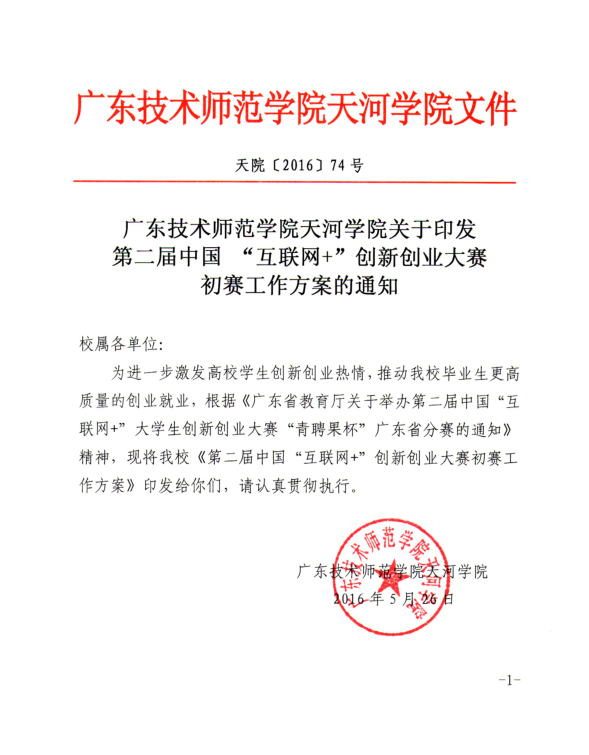 天院〔2016〕74号广东技术师范公告天河公告关于印发第二届中国 “互联网+”创新创业大赛初赛工作方案的通知