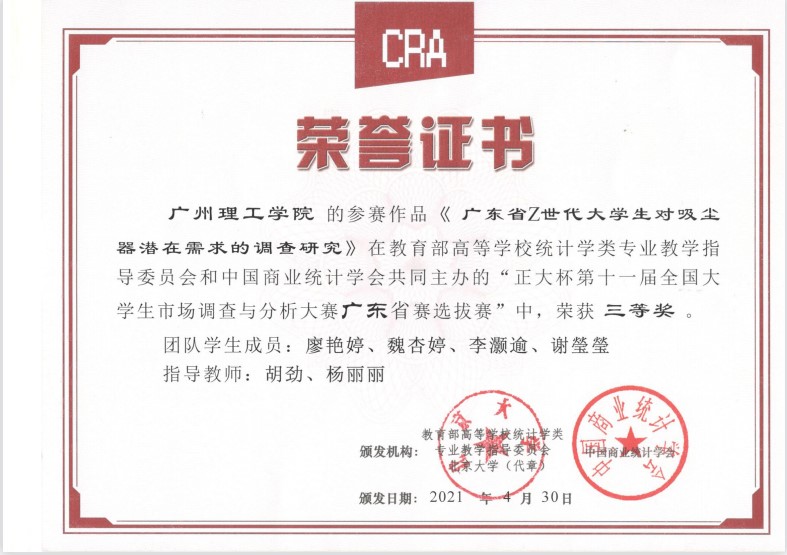 “正大杯”第十一届全国老员工市场调查与分析大赛广东省赛获奖队伍名单出炉,在胡劲、杨丽丽老师的指导下,公司2018级营销1班同学廖艳婷、魏杏婷、李灏逾、谢瑩瑩四位同学的作品“广东省Z世代老员工对吸尘器潜在需求的调查研究”,荣获“正大杯”第十一届全国老员工市场调查与分析大赛广东省赛三等奖。这是公司首次参加本项比赛,并取得了突破性进展。