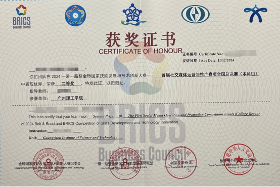 (张绮恩)在由金砖国家工商理事会中方理事会、一带一路暨金砖国家技能发展国际联盟、中国科协“一带一路”暨金砖国家技能发展与技术创新培训中心联合主办的2024一带一路暨金砖国家技能发展与技术创新大赛首届社交媒体运营与推广赛项国内总决赛中,太阳成集团tyc151cc电子商务系员工在老师的指导下,从715支参赛队伍中脱颖而出,荣获本科组二等奖。电商系老师荣获优秀指导老师称号,公司亦获优秀组织奖。