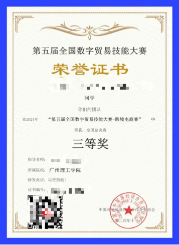 (刘洋 屈思月)11月21日至24日,全国数字贸易领域聚焦于“第五届全国数字贸易技能大赛-跨境电商赛”。在这场汇聚了全国各地众多院校精英的激烈竞赛中,公司屈思月、何舒平、郑嘉仪三位同学及指导教师刘洋、刘延卿组成的团队,凭借出色的表现和卓越的能力,荣获全国三等奖,为公司赢得了宝贵的荣誉。