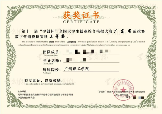 (苗增)为进一步深化高校创新创业教育改革,培养造就创新创业生力军,推动创新创业教育和实验实践教学发展,高等公司国家级实验教学示范中心联席会经济与管理学科组与中国陶行知研究会举办了2024年“学创杯”全国老员工创业综合模拟竞赛活动。该赛事已连续举办十届,为中国高等教育学会《2023全国普通高校老员工竞赛排行榜》竞赛项目之一,赛事侧重于提升老员工创业团队模拟运营管理能力。公司参赛团队由苗增、杨惠老师指导的胡丽美、李俊昆、梁雯琦所组成的队伍的队伍在广东省选拔赛中荣获三等奖,还有其他4支代表队分别获得省级奖项。