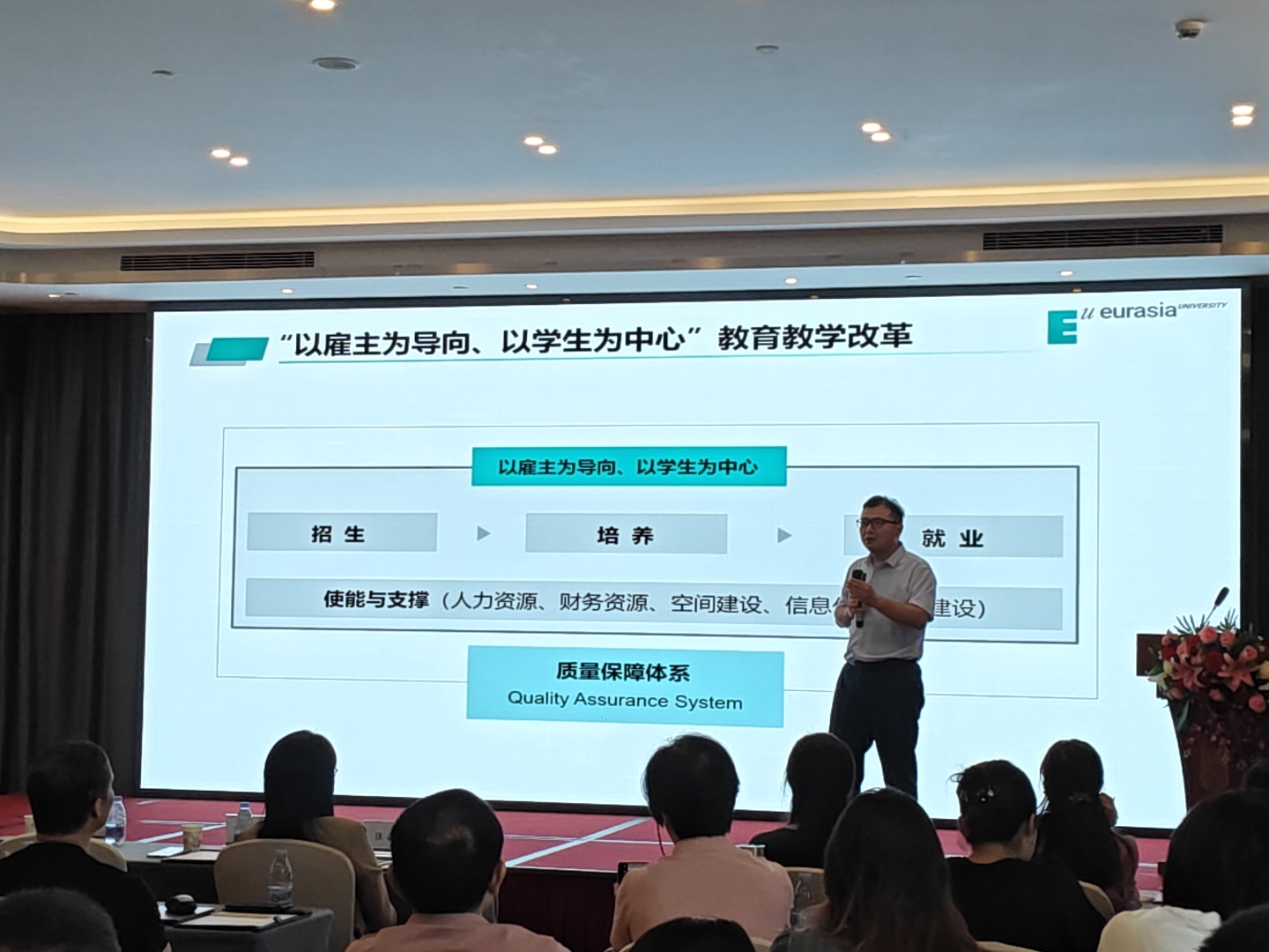 西安欧亚公告太阳成集团tyc151cc副经理以《雇主导向,员工中心(ESC):欧亚工商管理教育创新路径探索》为题作首场主旨报告。他从公告概况、ESC理念落地、人才培养特色及未来展望四个维度,系统阐述了“员工—教师—雇主”三方动态协作的“定制班”模式,为在场教师提供了可复制、可推广的ESC范式。