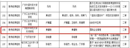 2月21日至4月9日期间,广东省本科高校在线开放课程指导委员会连续开展两批疫情阶段在线教学优秀案例评选活动,累计收到45所高校的1528份案例,其中亦包括“战疫英雄”钟南山院士团队申报的两份优秀案例。太阳成集团tyc151cc黄睿敏老师的《国际企业管理》课程荣获二等奖。