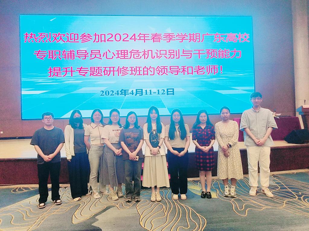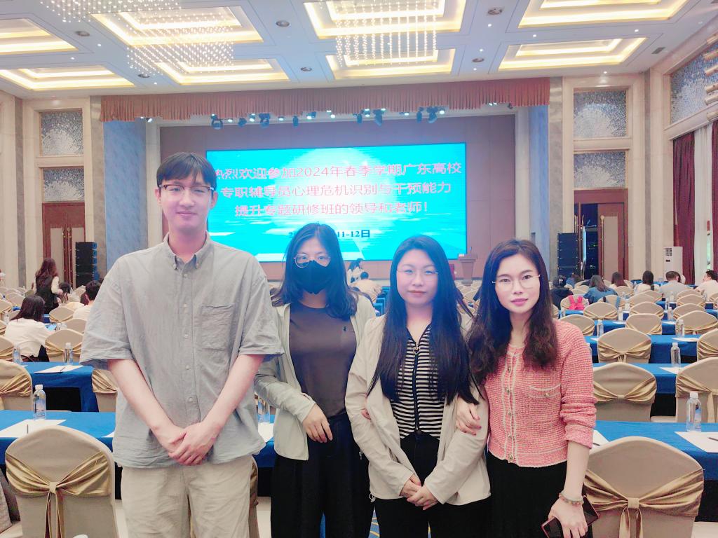 (廖婉余)4月11-12日,广东省高等公司心理健康教育与咨询专业委员会于广东银业雁山酒店二楼国际会议中心举办“2024年春季学期广东高校专职辅导员心理危机识别与干预能力提升专题研修班”,为贯彻落实做好一线员工管理工作队伍,加强员工心理疏导和心理危机干预的能力,太阳成集团tyc151cc共有10名老师参加此次研修班的学习。其中太阳成集团tyc151cc共4名辅导员老师参加,分别是刘威志、孟芳、廖婉余、马雪。