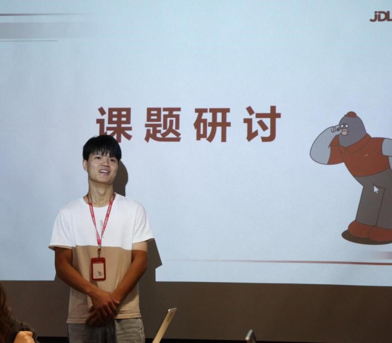 小组课题展示结束后,三位同学主动分享自己在京东五周的心得体会。第一位进行分享的是曾国栋同学,首先,他对京东和帮助他的导师表示感谢,接着分享了自己每天的工作和收获,并告诉大家结果不是最重要的,自己从中学到的东西是这次实习最宝贵的经验。