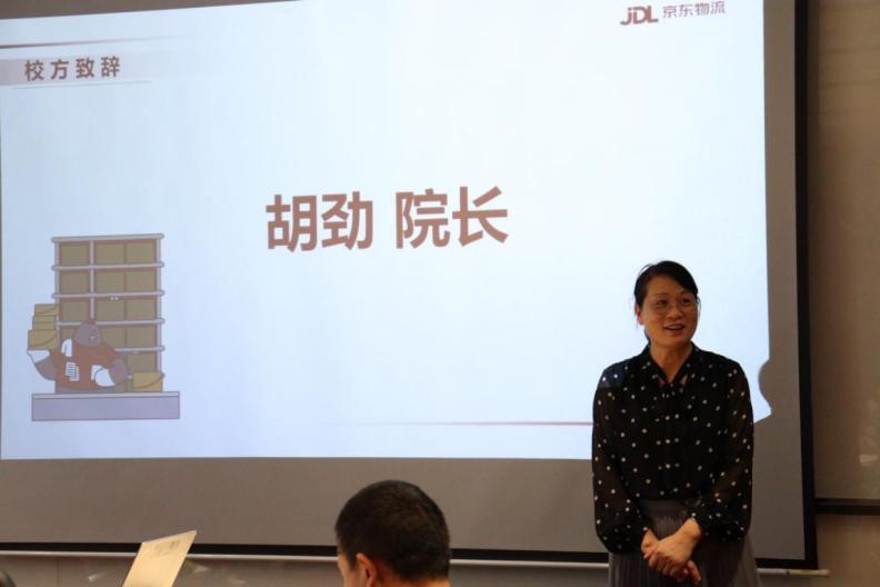 紧接着胡劲副经理代表校方致辞,首先她感谢京东物流集团给同学们提供了一次很好的实习机会,她赞扬京东是一个非常优秀的企业,京东的企业文化也非常强大以及深入人心,经过五周的实习,她在同学们身上看到了一个京东人影子。最后,她希望同学们把在京东工作的经验运用到今后的学习生活中,从中提升自己。