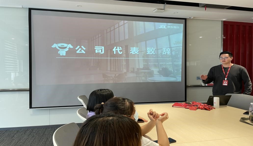 京东校企负责人梁梦君热情地接待同学们并安置好宿舍。在员工正式上岗实训前,企业专门召开了隆重的欢迎会。会上,企业导师梁梦君首先介绍了京东的核心价值观、企业文化以及接下来的工作安排等,并表示希望同学们在此次实习中能收获专业知识和提升职业能力,在京东生活愉快。