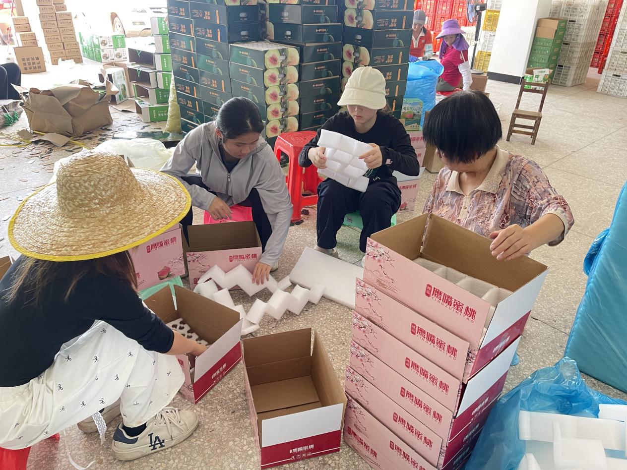 在鹰嘴桃产业供应链负责人谢少剑的带领下,实践团走进供应链中心,学习分拣、装箱等标准化操作流程,亲身参与包装环节。随后,团队通过电商直播,将鹰嘴桃的鲜甜与品质生动地呈现给观众,用实际行动拓宽销售渠道。团队成员表示,助农不仅要热情,更要深入产业脉络,用专业知识为农产品“走得更远”贡献力量。