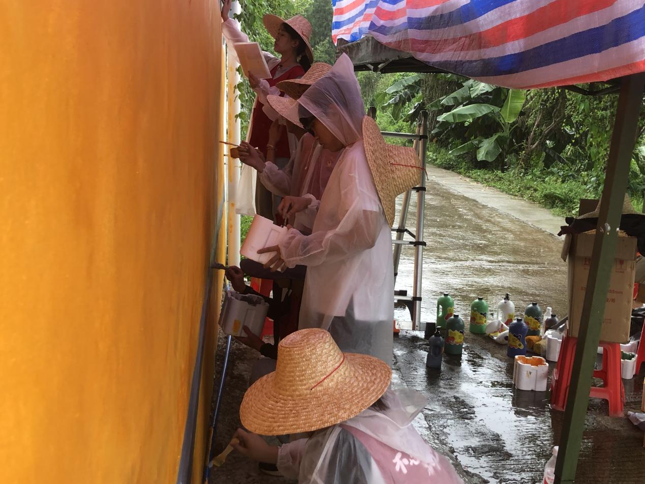 此次实践是一场青春与这片土地的双向成就。队员们白天顶着高温作画,汗水浸透衣衫却未曾停下画笔;晚上围坐讨论修改方案,让作品更贴合当地的风土气息。灵感从田间稻浪、花田美景而来,笔触里既有艺术的巧思,更有对土地的深情。正如队员们所说:“我们用色彩点亮了连州镇,而连州镇用真实教会了我们成长。”