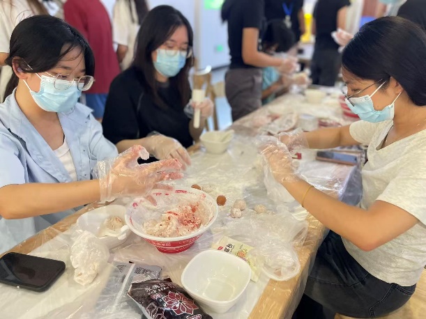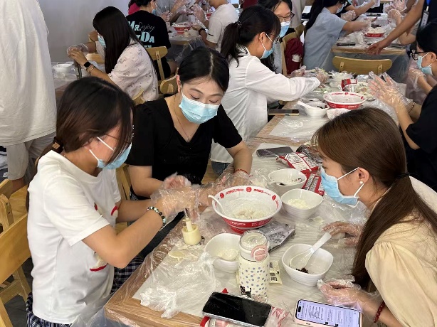现场热闹非凡:有人纠结馅料搭配,有人讨论造型设计,小组间互相“取经”借鉴。工作人员穿梭拍照,记录下大家蹙眉调整、笑着展示的专注瞬间,寻常场地俨然成了创意工坊。