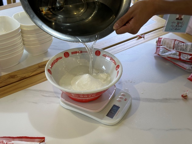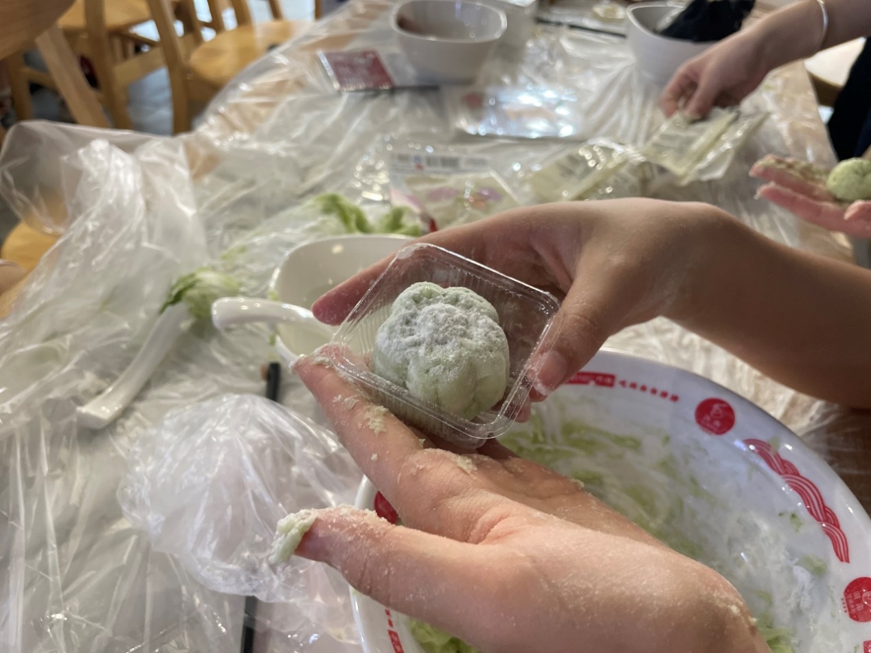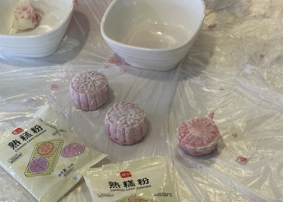 “冰皮粉与温水1:1调和,揉至光滑不粘手!”食堂张师傅携料登场,不仅备下“故宫红”“青釉蓝”双色冰皮,更带来祥云、瑞兽、等精致模具,引得众人围拢。面对“冰皮易裂”、“花纹不清”的疑问,张师傅俯身示范:“馅料搓圆如珠,冰皮中厚边薄,轻捏收口再压模。”他边说边动手修复裂开的面团,转眼做出一枚祥云月饼。随后又巡回各组指导,不多时,师生们手中都有了成型的半成品。