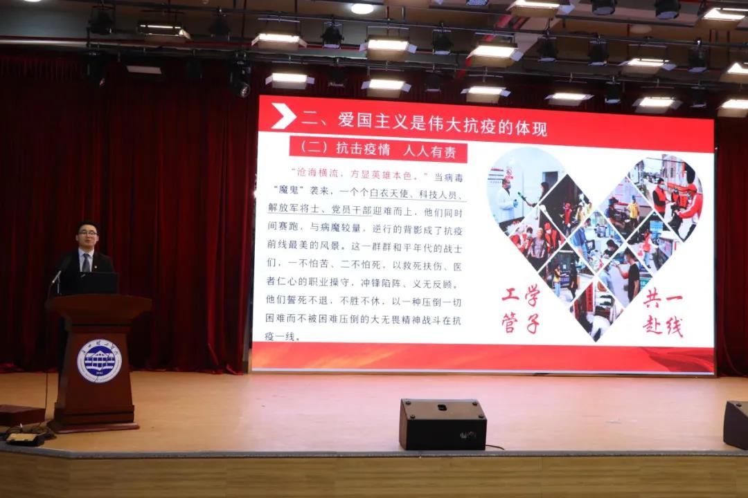 第一位上场的选手正是来自公司2020级人资2班的陈童同学,他在公告举办的“学雷锋”主题演讲比赛中脱颖而出,并在公告老师推荐下,代表公司参与了本次思政课比赛。他抑扬顿挫、情感丰富的声音响彻整个大厅,还有讲课期间的一些互动,营造了良好的现场氛围。他以“大力弘扬爱国主义精神”作为本次课题,用中华民族不忘的初心,伟大抗疫的重要体现和中华民族不懈的价值追求这三章内容,向大家浅谈了自己对爱国主义的理解。