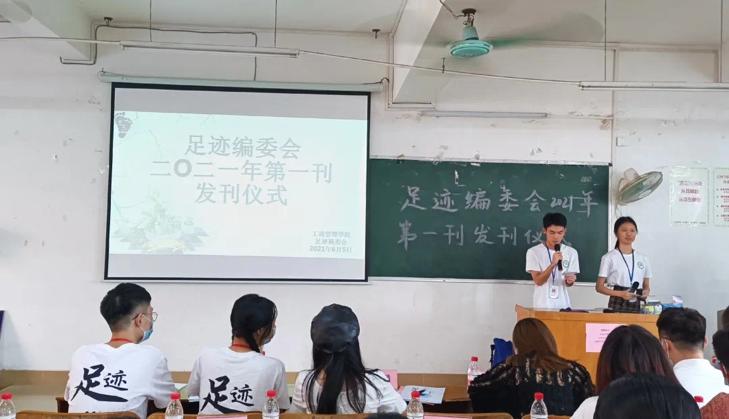 本次仪式由足迹编委会大一干事陈佩华和姚荣键进行主持。发刊仪式分六个环节,第一环节为视频播放,第二环节为杂志介绍,第三环节为颁奖仪式,第四环节为投稿作者发表感言,第五环节为指导老师发言,第六环节为合影留念。