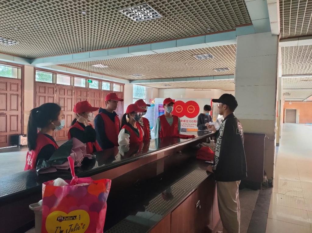 入党积极分子和发展对象按照规定时间准时到达7栋咨询台集合,负责人仵允秋同志为此次协助工作做了简要说明,并为志愿者们分发物资。他们穿着整齐的“红马甲”、佩戴党帽及工作证,为疫情防控贡献自己的力量。