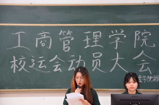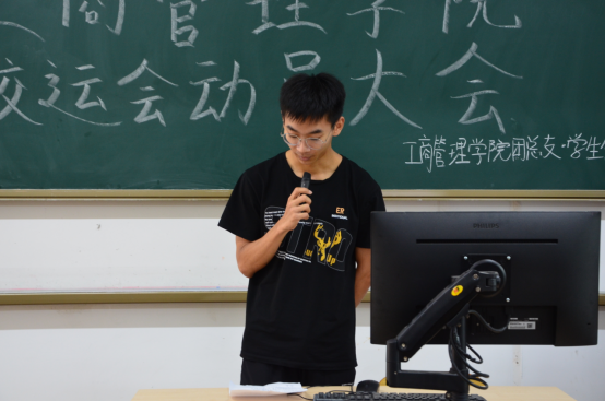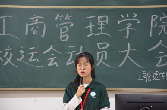 太阳成集团tyc151cc员工会文体艺术部副部陈芷晴发言,介绍赛前运动员注意事项,讲解校运会各项项目的比赛流程与比赛规则。