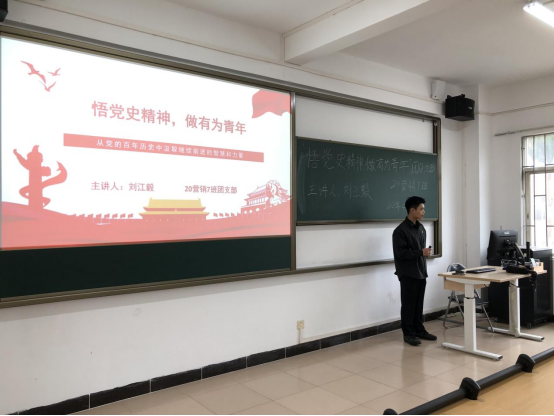 22电商2班在7栋501观看爱国电影《一九四二》,黎想同学做出观后感:“,一代人有一代人的担当与使命,但奋斗是不变的旋律,作为新时代的青年,我会不断充实自我,勇担时代重任。”22人资2班在7栋505的班级团日活动中进行党史学习教育何锦辉同学发表感想:“没有比脚更长的路,没有比人更高的山。我们青年一代,更要牢记担当使命,争做新时代新青年,为建设美丽国家贡献力量。”