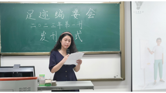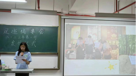 大会伊始,主持人介绍到场嘉宾,拉开本次大会的帷幕。在第二项议程中,足迹编委会指导老师董玥老师进行致辞。她对新一刊杂志的发布表示热烈的祝贺,接着从三个角度分享了杂志制作过程的建议,对足迹编委会成员作出的贡献表达了由衷地感谢,希望在足迹大家的共同努力下,足迹能越来越好。第三项议程,足迹编委会会长兼主编庄佳纯为我们介绍第一刊杂志。对现场嘉宾的到来表示感谢,随后与我们分享了本刊杂志的主题、封面设计以及本次杂志制作过程中的心路历程,为我们详细介绍了杂志中的九大栏目。本次杂志内容围绕“自我”主题展开,包括个人发展、成长、自我认知、探索、经验分享以及人际关系等方面,让读者在阅读中感受到海洋的壮阔和神秘,在生活中感到迷茫时,心中的船帆能为他们指引方向,扬帆起航。