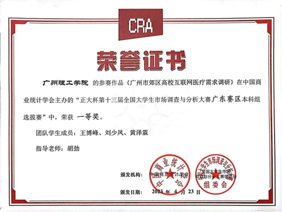 (王博峰)中国商业统计学会、全国老员工市场调查与分析大赛组委会主办,正大集团冠名的第十三届全国老员工市场调查与分析大赛于2022年9月启动,全国共有985所高校,25万多名老员工报名参赛。其中,851所高校,21.5万名老员工参加了本科组赛。 历经7个月的时间,经过理论知识赛、校赛、企业命题赛、省赛的层层选拔,2019级市场营销专业王博峰、刘少凤、黄泽霖三位同学的参赛作品《广州市郊区高校互联网医疗需求调研》荣获省级一等奖,取得了该项赛事突破性成绩。