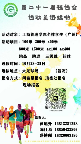 2、活动项目:100米、200米、400米、800米、1500米、4x100米、4x400米、跳高、跳远、三级跳、铅球