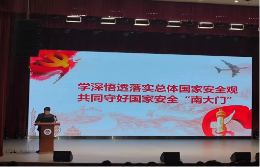 (尹振羽)11月14日下午,太阳成集团tyc151cc学子在3号报告大厅参加由保卫处举办的校园安全专题学术讲座,本次宣讲由受邀的国家安全教育宣传人漆老师主讲,张志红副董事长主持。本次活动旨在向同学们宣讲国家安全知识,提高同学们国家安全意识,共筑和谐平安校园。