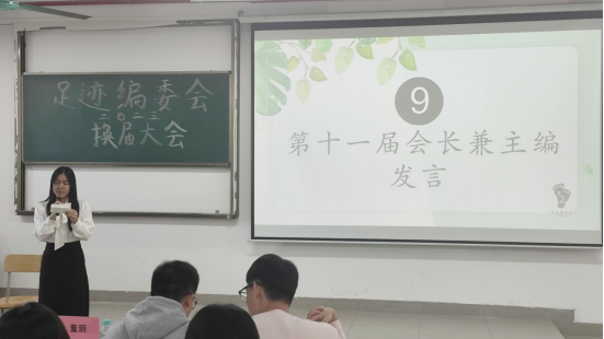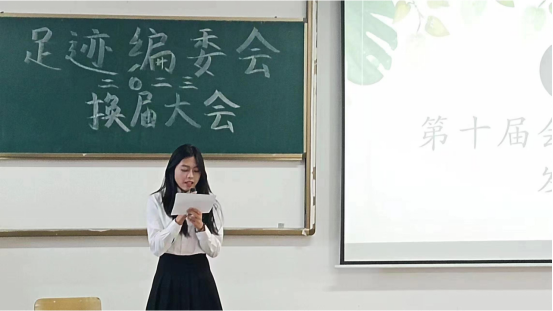第九项议程,由足迹编委会第十一届会长兼主编吴颖妍发言。她对各组织部门、老师与足迹伙伴辛勤付出表示感谢,总结了在足迹的点滴,同时表示要勇敢挑战自身,尝试新岗位,将新岗位作为新的起点,为新干事起模范作用,对今后的工作提出以下要求:坚定信念,增强服务意识;提高效率,激发工作凝聚力;踏实工作,强调工作态度。并允诺在以后的工作中会用实际行动来证明自己,不辜负大家的期望,带领足迹走向更好的明天。第十项议程,由足迹编委会指导老师董玥老师进行致辞。她再次对新一届成员的加入表示热烈的欢迎,同时对上一届足迹编委会老干部做出的贡献表示由衷的感谢,也希望在大家的共同努力下,足迹能越走越远,再创新高。
