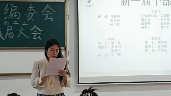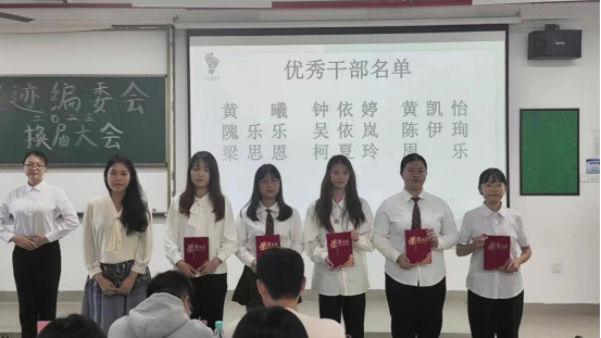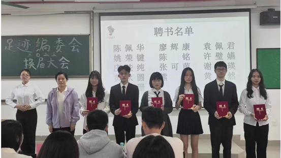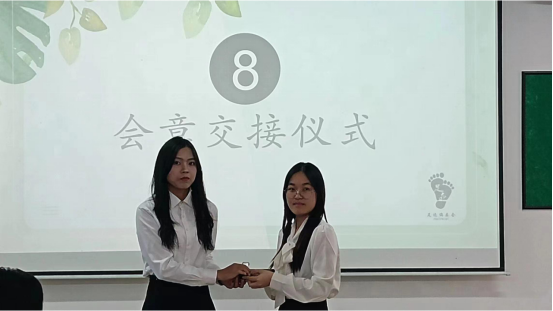第七项议程,足迹编委会指导老师董玥老师宣读新一届干部名单,对新鲜血液的到来表示热烈的欢迎,同时也相信新鲜血液的流入将让足迹编委会呈现出更新的姿态;第八项议程,进入会议最庄严而又神圣的会章交接环节,第十届会长兼主编庄佳纯与新任会长兼主编吴颖妍进行会章交接仪式。这意味着足迹编委会踏上新的征程,留下新的足迹。风正济时,自当扬帆破浪,相信在吴颖妍会长的带领下,足迹编委会的光芒将愈发闪耀,照亮所有人的足迹。