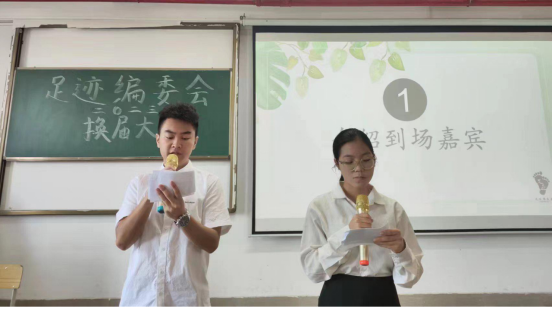 大会伊始,主持人介绍到场嘉宾,拉开本次大会的帷幕。随着活泼的音乐响起,大屏幕画面一转,带领现场观众进入本次大会的第二项议程——播放“足迹回顾”视频。视频中记录了足迹编委会的换届寄语、日常工作、团建娱乐等,展现了大家留下的每一足迹,不可否认,这是足迹编委会全体人员万分珍贵的回忆。