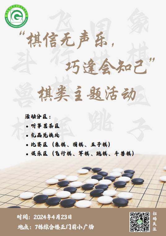 棋逢对手千般乐,在这春意盎然的时节,我们欢迎每一位热爱棋类文化的同学共赴这场盛会,享受棋艺与心灵的精彩邂逅。4月23日,让我们一在7栋综合楼正门前的小广场领略棋类文化的博大精深,体会以棋修身、以棋养性的独特魅力吧!