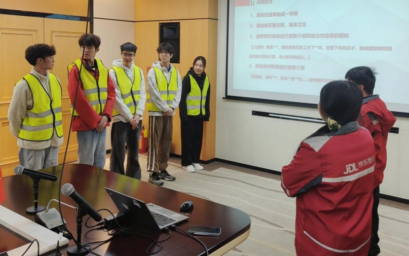 欢迎会结束后,企业导师团队为员工安排的“拜师仪式”正式启动,京东物流资深技术导师与部门主管一一结对实习生,通过“师徒制”传承岗位技能与职业经验;随后安全防损培训以案例分析与实操演示相结合的方式,强化员工的安全意识;最后,各部门负责人带领员工前往岗位学习,开启“工学交替”的实践之旅。