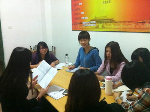 管理系员工党员工作站与员工党支部的党员在制作活动横幅