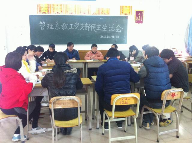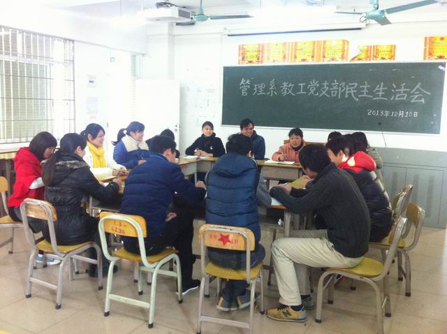 本系讯(通讯员:林成园)12月10日,管理系在六栋309召开了教工党支部民主生活会。本次民主生活会的主题是“贯彻公告文件精神,全面提高教工党员党性修养”,进行了教工党员的批评与自我批评。会议由我系党总支书记杨晓文主持,全体教工党员参加了会议。