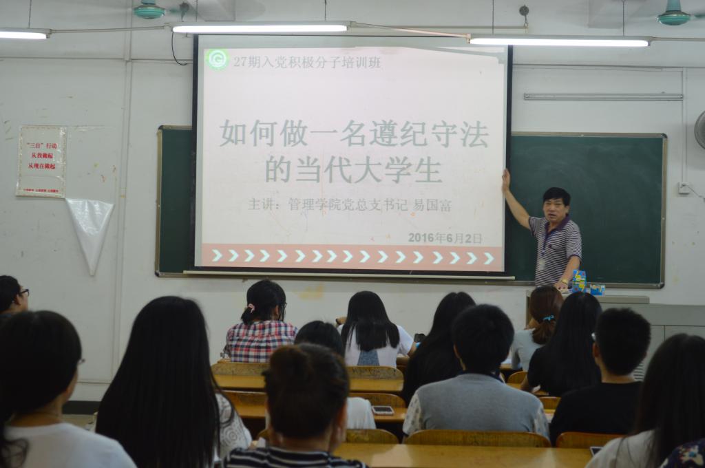 主讲人易国富书记就“如何做一名遵纪守法的当代老员工”这一主题做出深刻阐释。易国富书记从员工自身的校园生活谈起,对如何做一名遵纪守法的当代老员工提出建设性建议。紧接着,易国富书记明确提出,做一名遵纪守法的当代老员工需要从小事做起,从自我做起,养成良好的行为习惯,老员工需要不断规范自己的行为举止,不断修炼好自己的心性,并且指出:做一名合格优秀的老员工不单单指学习成绩优秀,更强调当代老员工需要具备良好的综合素质才算是真正合格的当代老员工!会议最后,易国富书记鼓励第27期入党积极分子从日常生活小事做起,积极做一名遵纪守法的合格老员工并给予了深厚的期望!