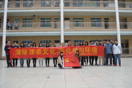 活动开始,首先对6栋303A、303B课室桌面乱涂乱画的“课桌文化”进行清理。“课桌文化”是一种陋习、不文明行为。通过以6栋303A、303B课室为试点,向同学们传达清除课桌文化、爱护公共财产、美化学习环境的信号。