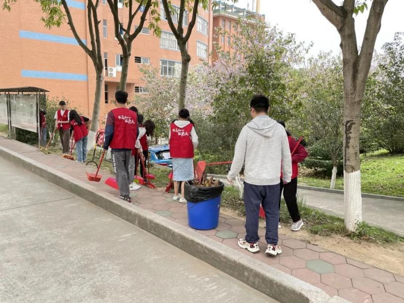二队党员同志们对环绕综合楼、经管楼、图书馆的沿途街道上的落叶、有色垃圾等废弃物进行打扫清理,同志们有序地分工明确,高效有质地进行垃圾集中。一群身穿红马甲的少年,一丝不苟地打扫着残花落叶,在绿茵道上洋溢着青春气息,让本就绿色的校园春景,焕发出更加饱满的活力与生机。
