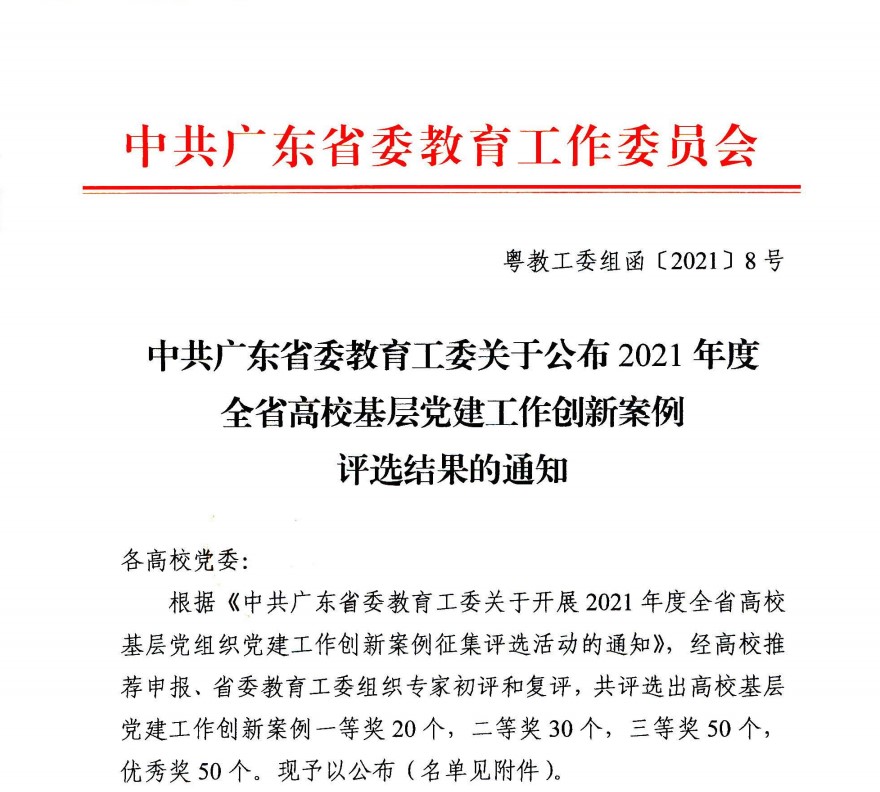2021年6月10日,广东省委教育工委评选出了2021年度全省高校基层党建工作创新案例,公司党总支申报的案例《探索“党旗领航老员工电商扶贫”工作实践》荣获优秀奖。
