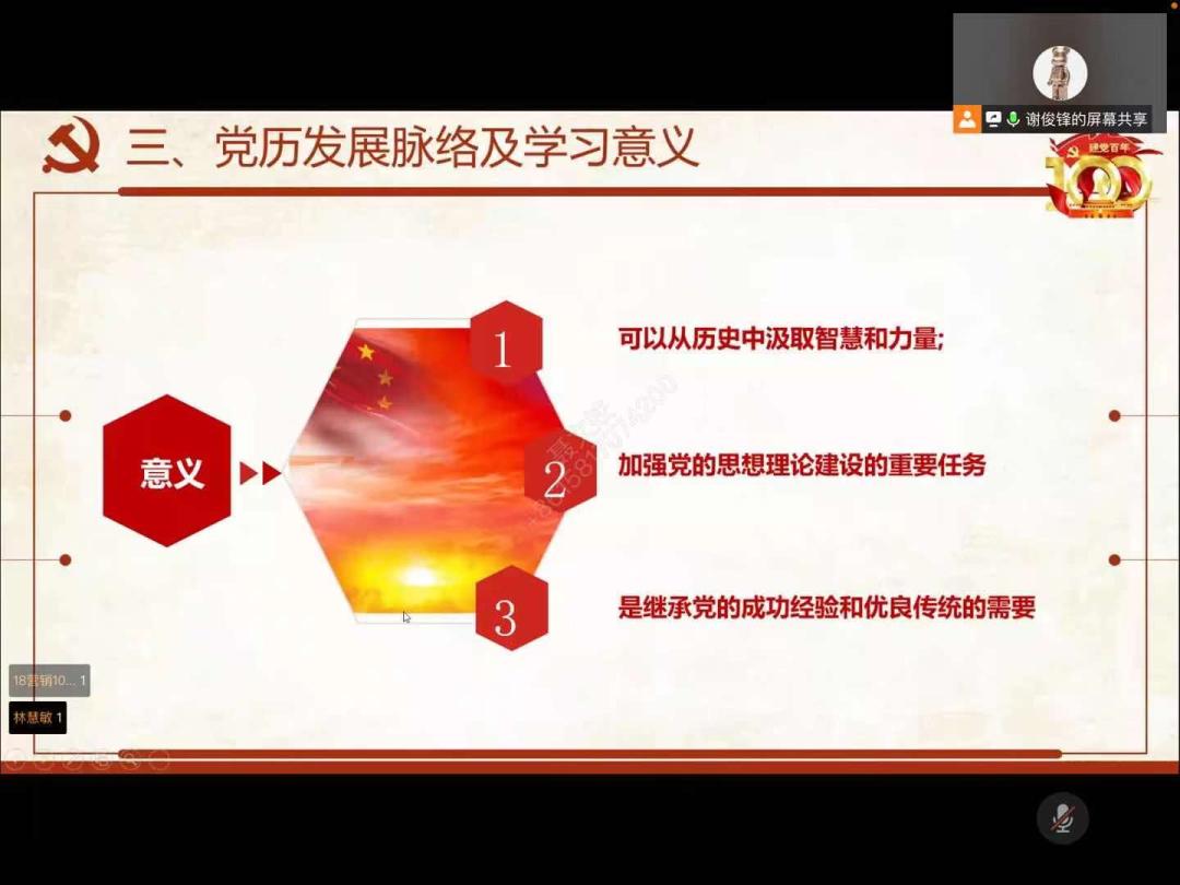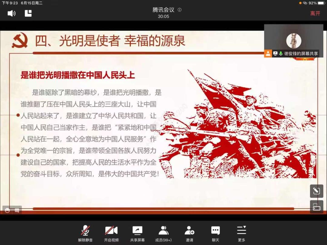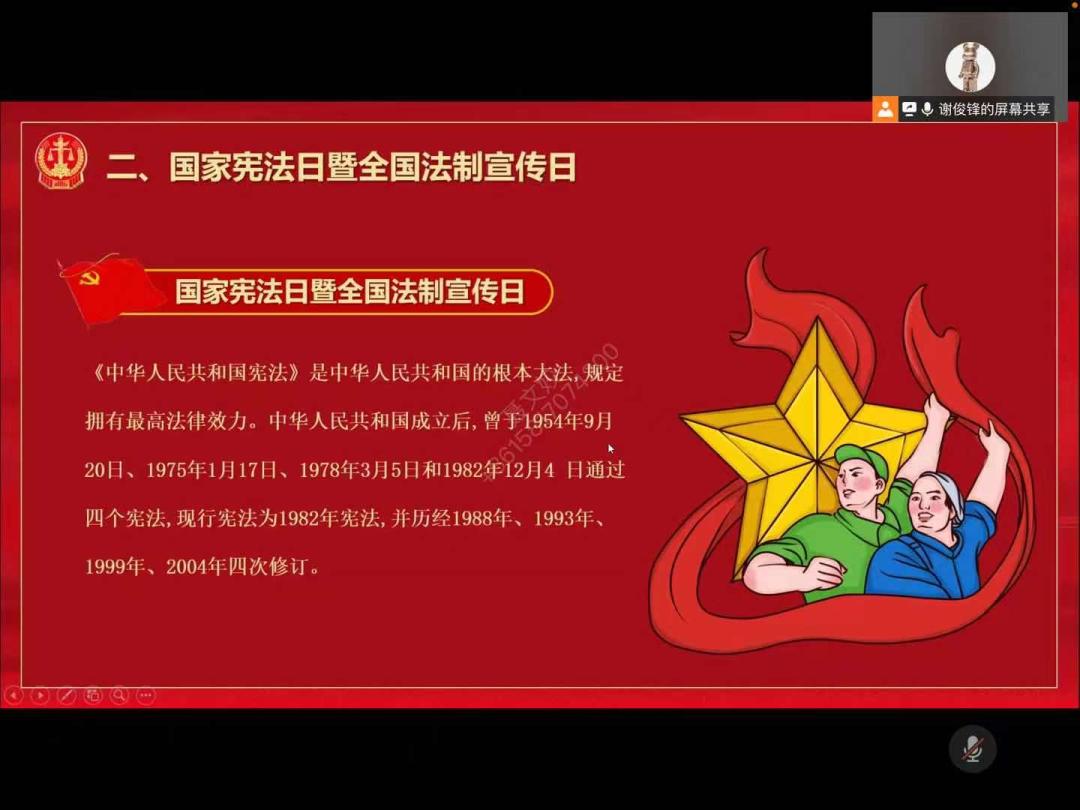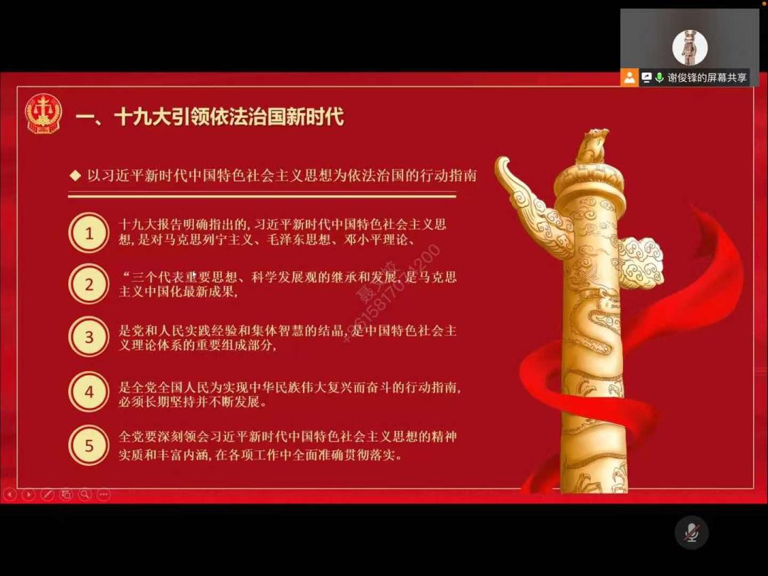 为深入学习贯彻习近平法治思想认真贯彻落实党中央关于推进法治中国和法治社会建设,进一步推进公司法治教育、安全教育落到实处、取得实效,不断增强公司员工的法治意识,提高公司员工法治素养,公司党总支于2021年6月15日晚上21:00举行线上法治教育会议,公司在校员工党员按时参加了此次会议,会议主讲人由谢俊锋同志担任。