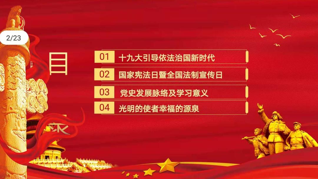 会议内容主要是从十九大引领依法治国新时代、国家宪法日暨全国法制宣传日、党史发展脉络及学习意义、光明的使者幸福的源泉这四部分展开。