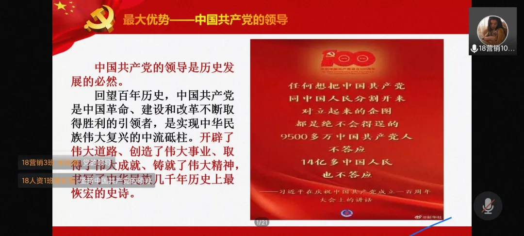 会议主要从“银河号”事件、“南斯拉夫大使馆被炸”事件、“孟晚舟”事件、最大优势——中国共产党的领导、“两个辛丑年”对比这五部分的内容展开学习。