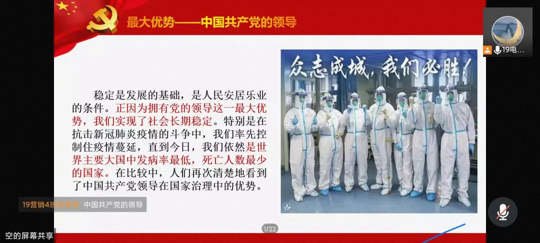 19营销1班李露月:我明白了我们中国的发展离不开中国共产党的领导,非同寻常的经历锻造出中国共产党不畏艰险、吃苦耐劳的精神。中国共产党始终与人民共甘苦,把人民对美好生活的向往作为奋斗目标,在中国共产党的带领下,中国取得了世界瞩目的辉煌成就,创造了“中国奇迹”。面对错综复杂的挑战,中国共产党带领中国人民成功抗击新冠肺炎疫情,快速实现了经济复苏增长,为世界和平与发展作出了积极贡献。而中国共产党带领中国人民不断取得新的成就,我认为有三个方面的经验特别重要。一是始终坚持以人民为中心。二是审时度势,重视加强自身建设。三是勇于寻求创新,保持旺盛的生命力。