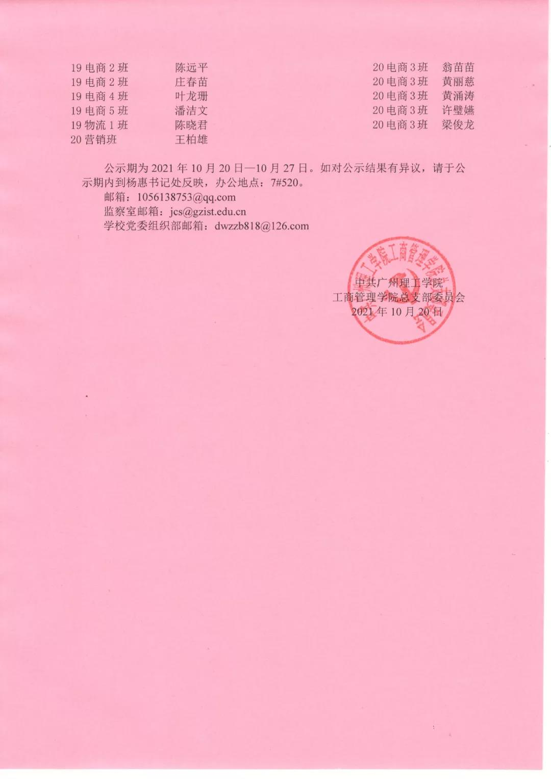 公示期为2021年10月20日—10月27日。如对公示结果有异议,请于公示期内到杨惠书记处反映,办公地点:7#520。